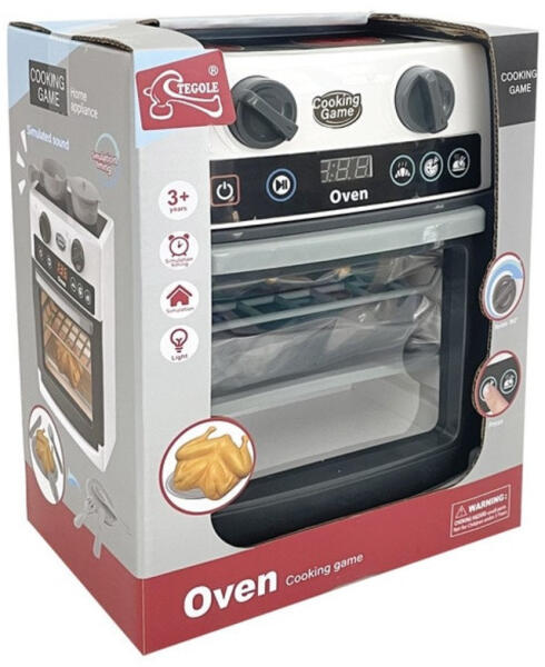 Mitől különleges ez a játék?Interaktív kezelőfelület A forgatható gombok és a világító sütőtér valósághűvé teszik a játékot, és segítik a kéz-szem koordináció fejlődését. Komplett kiegészítő szett A sütő mellett edények, evőeszközök és egy sült csirke is a csomag része, ami végtelen játéklehetőséget biztosít. Kettős funkció A készülék nemcsak sütőként, hanem a tetején található főzőlapoknak köszönhetően tűzhelyként is használható a még komplexebb játékélményért. Hasznos információkGyártó EgyébAjánlott életkor 3 éves kortólAnyaga műanyagSzín fehér, fekete, szürkeFunkciók fény- és hanghatásokCsomagolás tartalma 1 db játéksütő, 1 db sült csirke figura, edények, evőeszközökElem szükséglet szükséges (a csomag nem tartalmazza)Egyéb tudnivalók